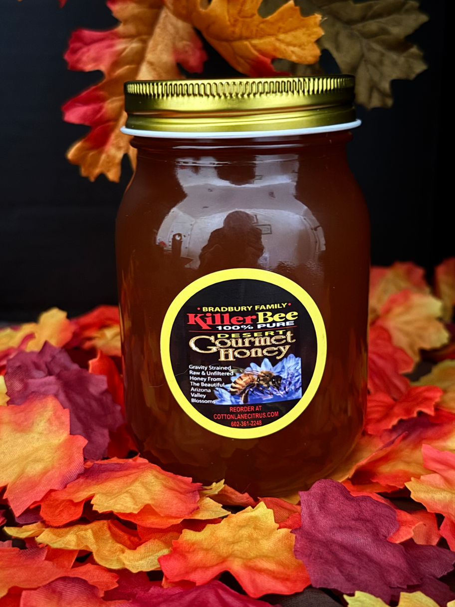 1 1/2 pounds of Killer Bee Raw Honey in a glass Jar.